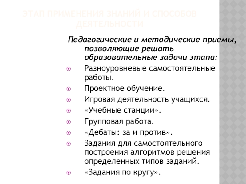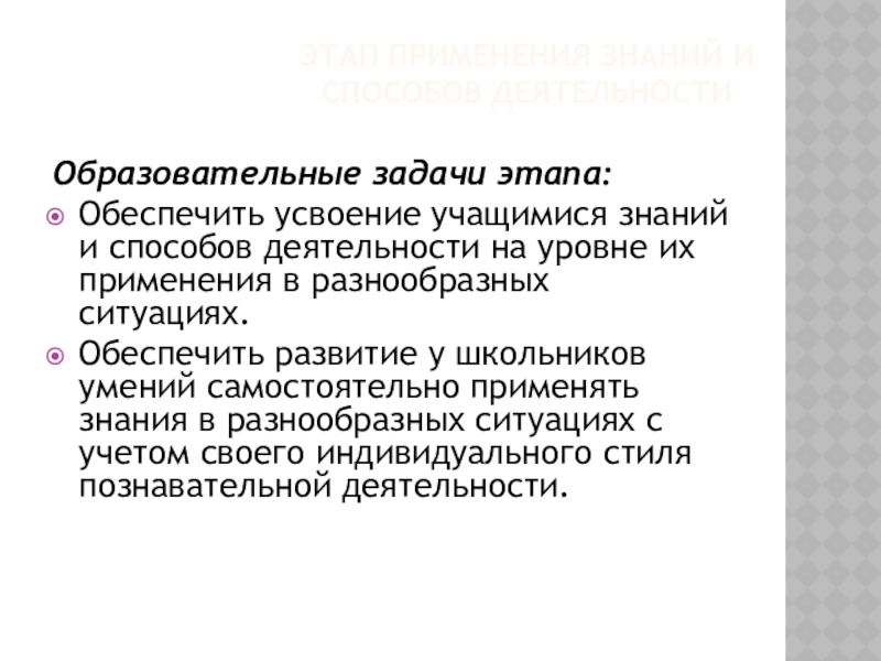 Слайд 20ЭТАП ПРИМЕНЕНИЯ ЗНАНИЙ И СПОСОБОВ ДЕЯТЕЛЬНОСТИ