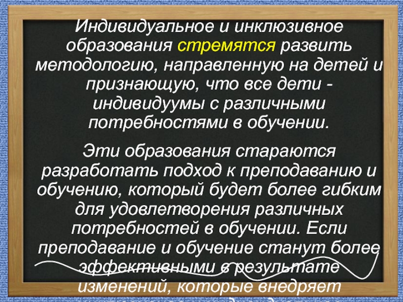 Слайд 13Индивидуальное и инклюзивное образования стремятся развить методологию, направленную на детей и