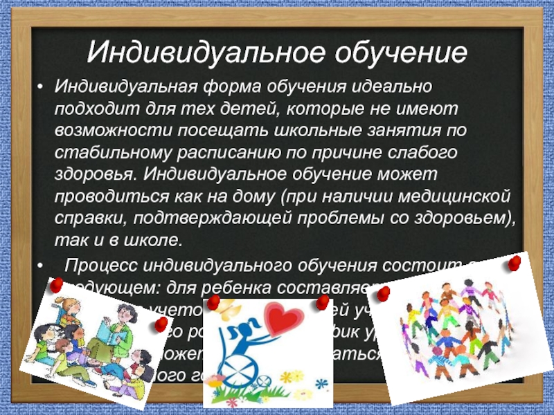 имеют возможности посещать школьные занятия по стабильному расписанию по причине слабого здоровья. Индивидуальное обучение может проводиться как на дому (при наличии медицинской справки, подтверждающей проблемы со здоровьем), так и в школе.