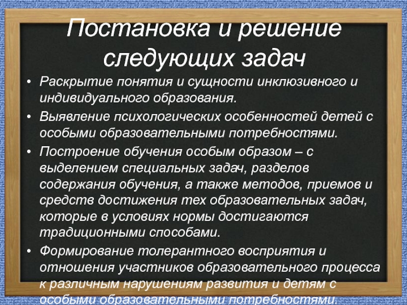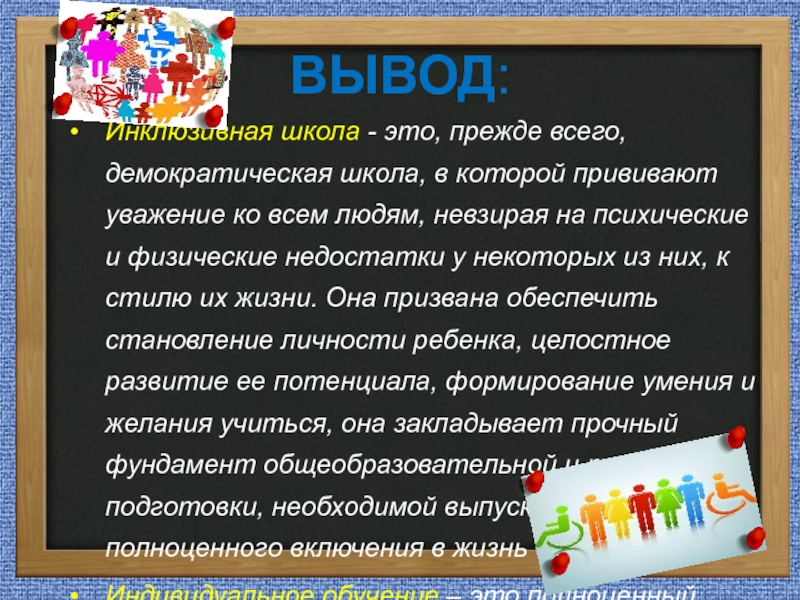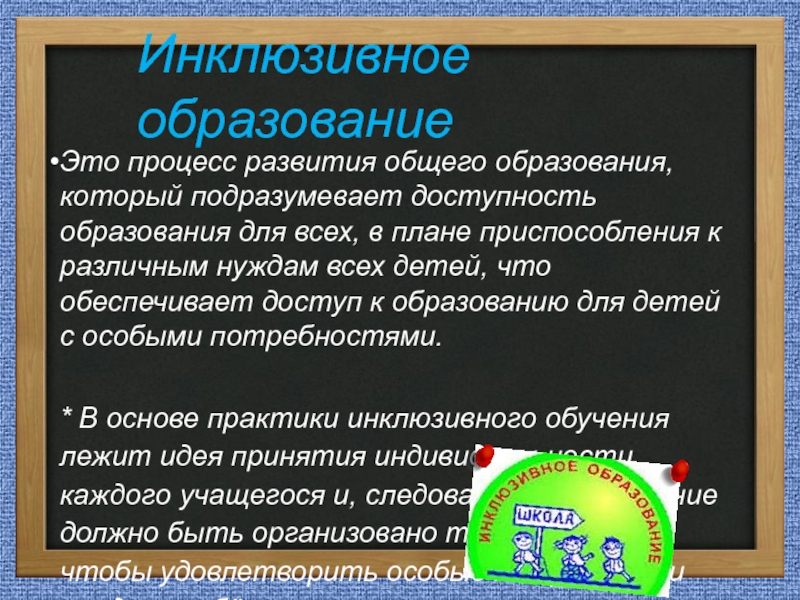 * В основе практики инклюзивного обучения лежит идея принятия индивидуальности каждого учащегося и, следовательно, обучение должно быть организовано таким образом, чтобы удовлетворить особые потребности каждого ребёнка.