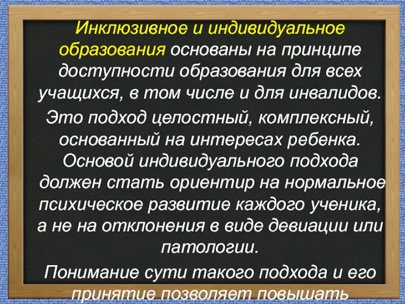 Слайд 12Инклюзивное и индивидуальное образования основаны на принципе доступности образования для всех