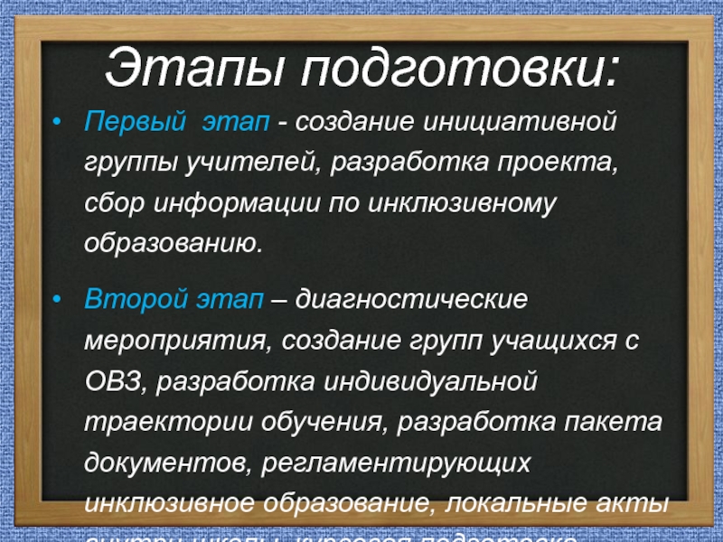 Второй этап – диагностические мероприятия, создание групп учащихся с ОВЗ, разработка индивидуальной траектории обучения, разработка пакета документов, регламентирующих инклюзивное образование, локальные акты внутри школы, курсовая подготовка участников эксперимента, информирование общественности по внедрению инновации.
