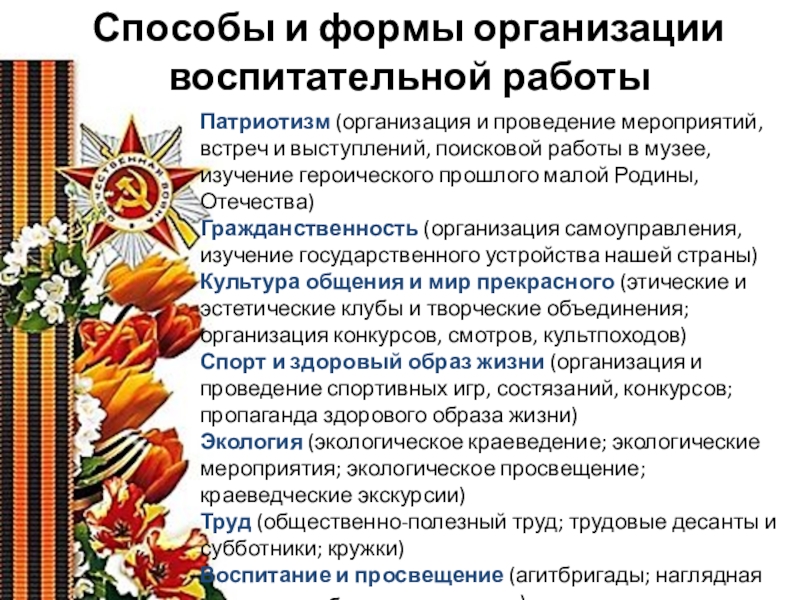 проведение внеклассных мероприятий на патриотическую тему, классные часы, вечера, литературные гостиные, интеллектуально-познавательные программы, праздничные утренники, спортивные мероприятия.