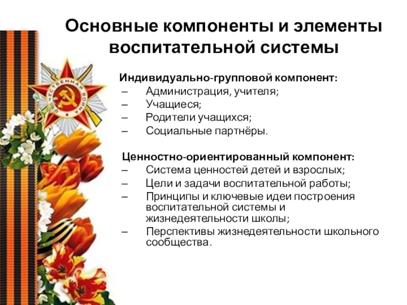 Слайд 10Основные компоненты и элементы воспитательной системы