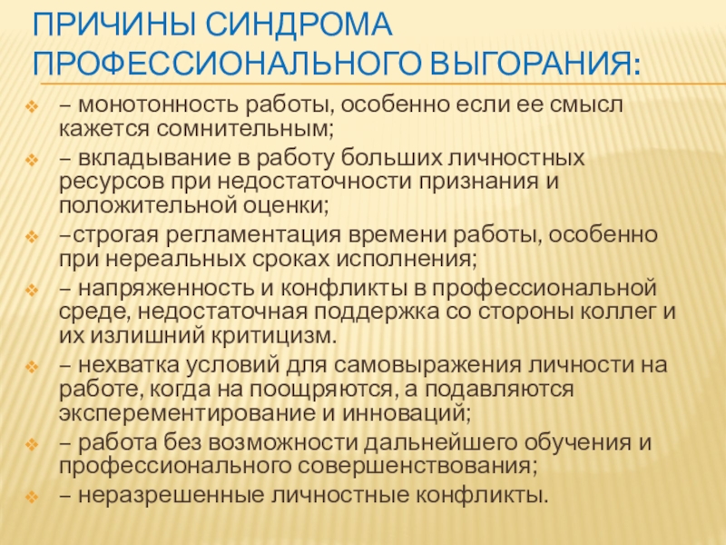 – напряженность и конфликты в профессиональной среде, недостаточная поддержка со стороны коллег и их излишний критицизм.