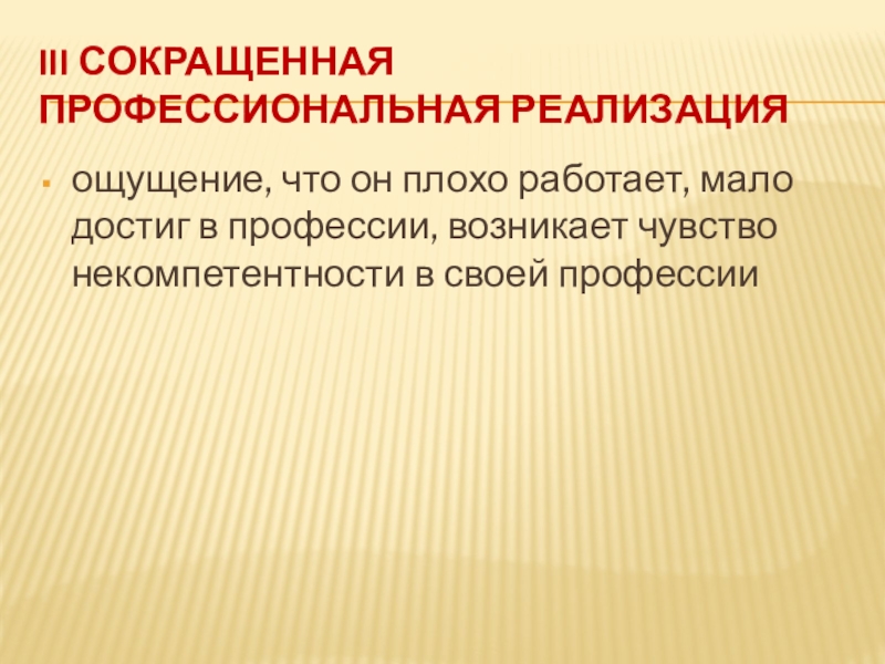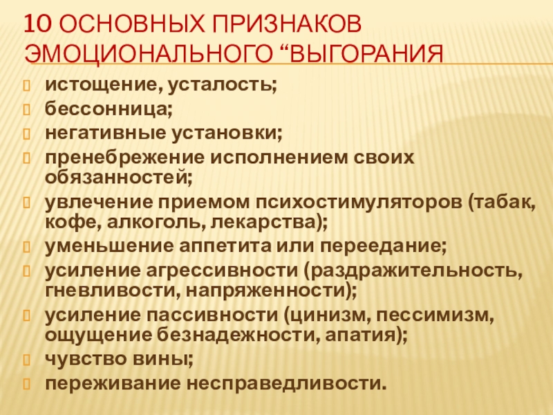 Синдром выгорания выражается в депрессивном состоянии, чувстве усталости и опустошенности, недостатке энергии и энтузиазма, утрате способностей видеть положительные результаты своего труда, отрицательной установке в отношении работы и жизни вообще.