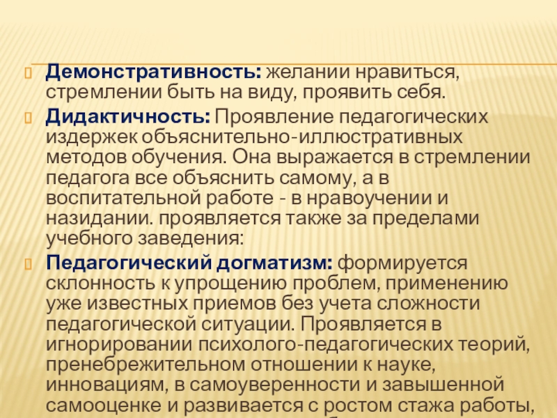 Педагогический догматизм: формируется склонность к упрощению проблем, применению уже известных приемов без учета сложности педагогической ситуации. Проявляется в игнорировании психолого-педагогических теорий, пренебрежительном отношении к науке, инновациям, в самоуверенности и завышенной самооценке и развивается с ростом стажа работы, сопровождаясь снижением общего интеллекта.