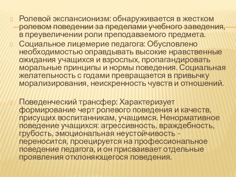 Слайд 26Ролевой экспансионизм: обнаруживается в жестком ролевом поведении за пределами учебного заведения,