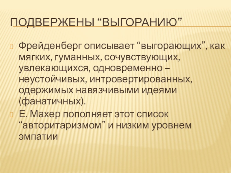 Фрейденберг описывает “выгорающих”, как мягких, гуманных, сочувствующих, увлекающихся, одновременно