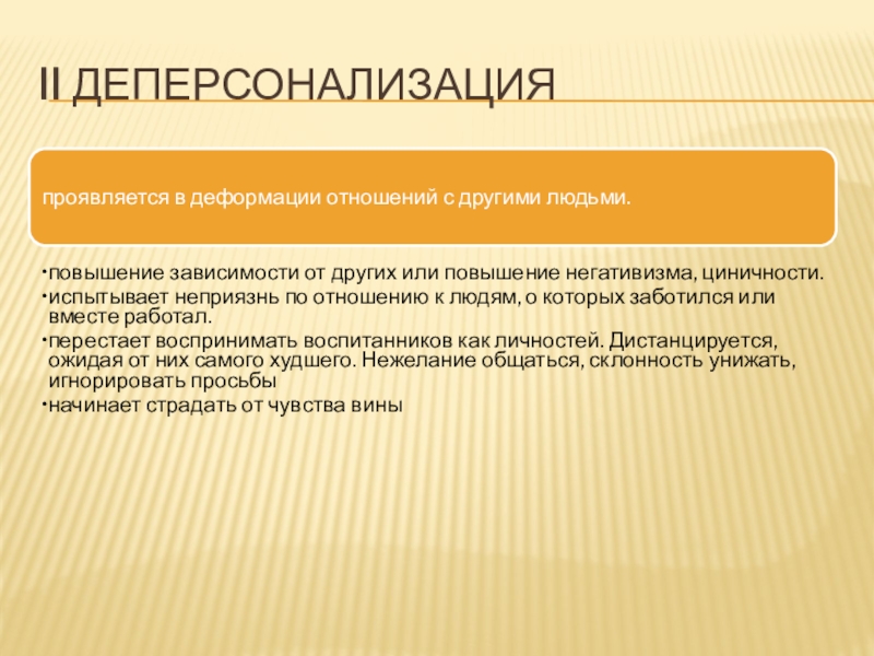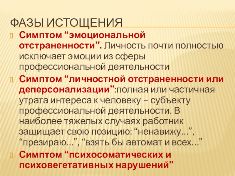 Симптом “личностной отстраненности или деперсонализации”:полная или частичная утрата интереса к человеку – субъекту профессиональной деятельности. В наиболее тяжелых случаях работник защищает свою позицию: “ненавижу…”, “презираю…”, “взять бы автомат и всех…”