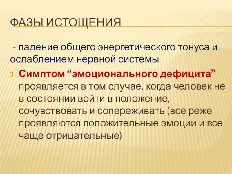 “эмоционального дефицита” проявляется в том случае, когда человек не в состоянии войти в положение, сочувствовать и сопереживать (все реже проявляются положительные эмоции и все чаще отрицательные)