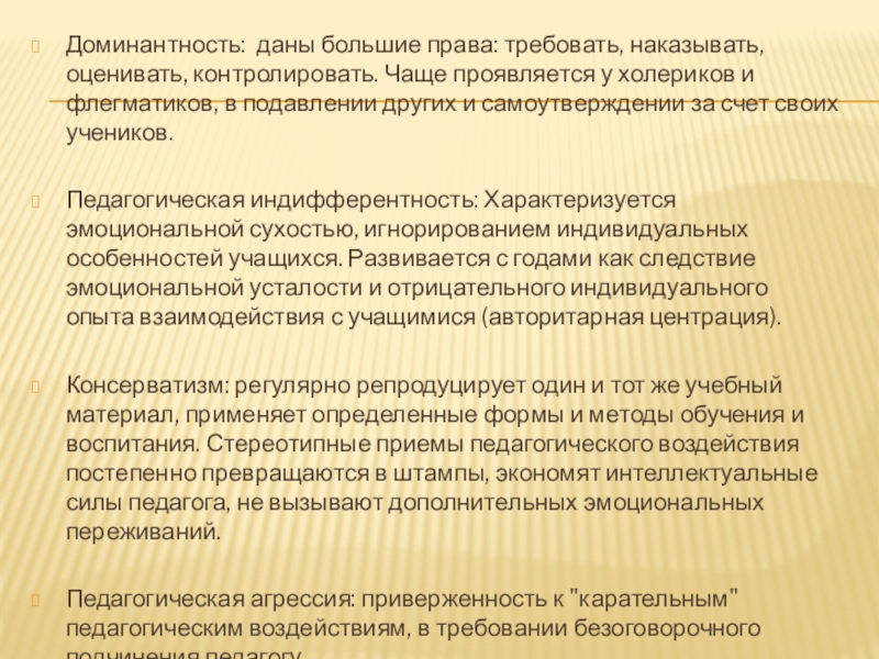 Педагогическая индифферентность: Характеризуется эмоциональной сухостью, игнорированием индивидуальных особенностей учащихся. Развивается с годами как следствие эмоциональной усталости и отрицательного индивидуального опыта взаимодействия с учащимися (авторитарная центрация).