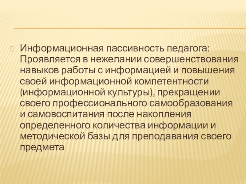 Слайд 27Информационная пассивность педагога: Проявляется в нежелании совершенствования навыков работы с информацией