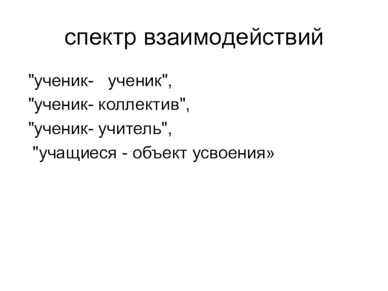 интеграция взаимосвязанных процессов взаимодействия педагогов с воспитанниками, родителями, общественностью; взаимодействия учащихся между собой, с предметами материальной и духовной культуры и т.п. Именно в процессе взаимодействия устанавливаются и проявляются информационные, организационно-деятельностные, коммуникативные и другие связи и отношения