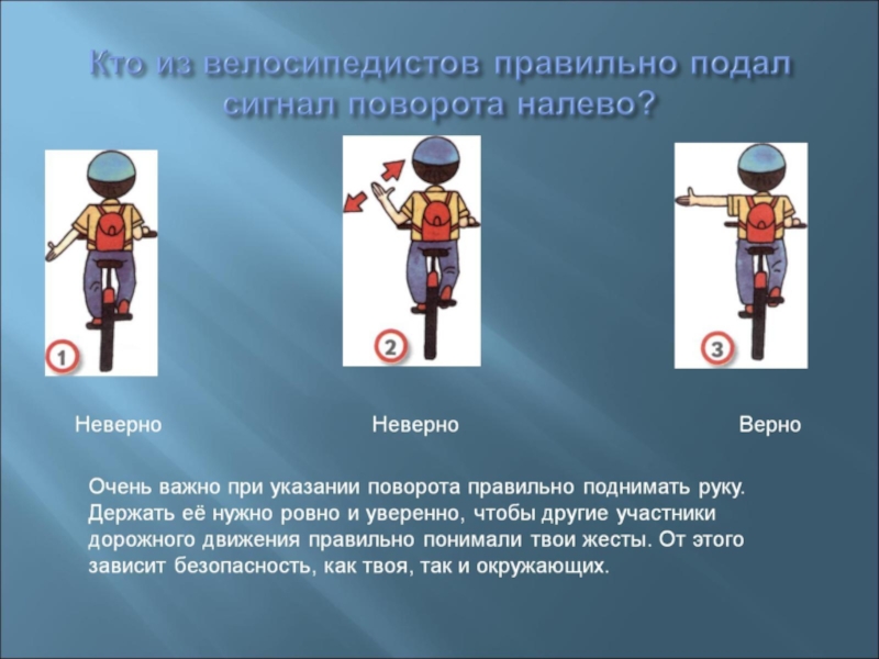 Слайд 18Кто из велосипедистов правильно подал сигнал поворота налево?