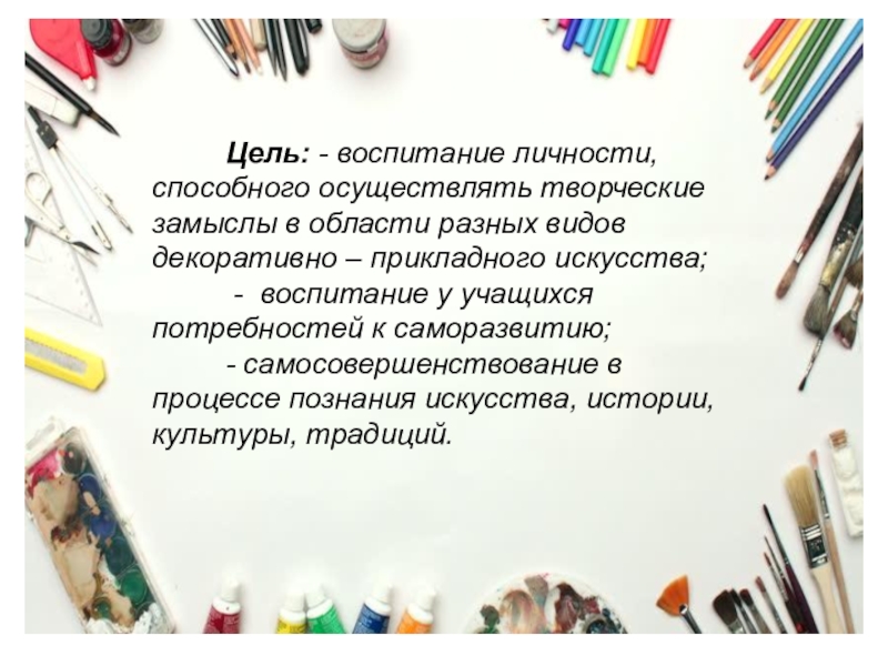 Цель: - воспитание личности, способного осуществлять творческие замыслы в области разных видов декоративно – прикладного искусства; - воспитание у учащихся потребностей к саморазвитию;