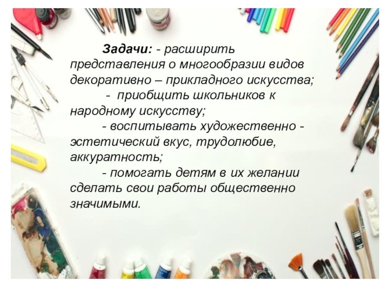 Задачи: - расширить представления о многообразии видов декоративно – прикладного искусства;