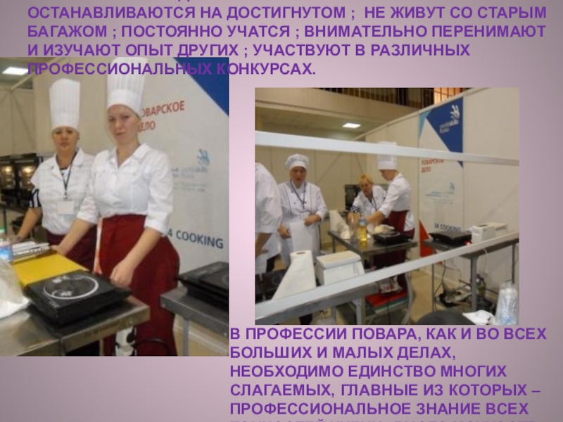 ЧТО ХАРАКТЕРНО ДЛЯ НАШИХ МАСТЕРОВ? ОНИ НЕ ОСТАНАВЛИВАЮТСЯ НА ДОСТИГНУТОМ ; НЕ ЖИВУТ СО СТАРЫМ БАГАЖОМ ; ПОСТОЯННО УЧАТСЯ ; ВНИМАТЕЛЬНО ПЕРЕНИМАЮТ И ИЗУЧАЮТ ОПЫТ ДРУГИХ ; УЧАСТВУЮТ В РАЗЛИЧНЫХ ПРОФЕССИОНАЛЬНЫХ КОНКУРСАХ.