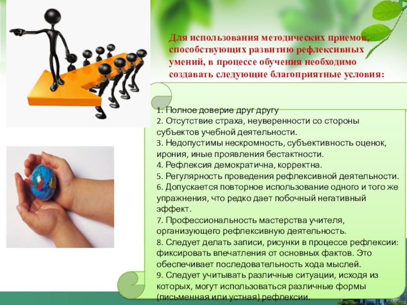 8. Следует делать записи, рисунки в процессе рефлексии: фиксировать впечатления от основных фактов. Это обеспечивает последовательность хода мыслей.