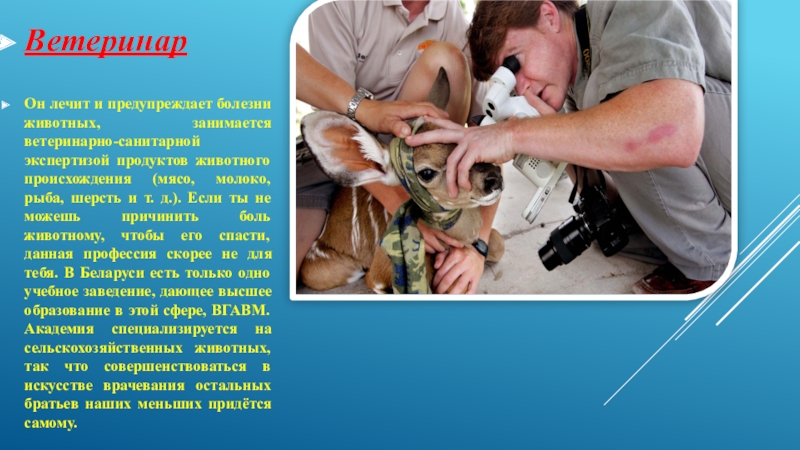 происхождения (мясо, молоко, рыба, шерсть и т. д.). Если ты не можешь причинить боль животному, чтобы его спасти, данная профессия скорее не для тебя. В Беларуси есть только одно учебное заведение, дающее высшее образование в этой сфере, ВГАВМ. Академия специализируется на сельскохозяйственных животных, так что совершенствоваться в искусстве врачевания остальных братьев наших меньших придётся самому.