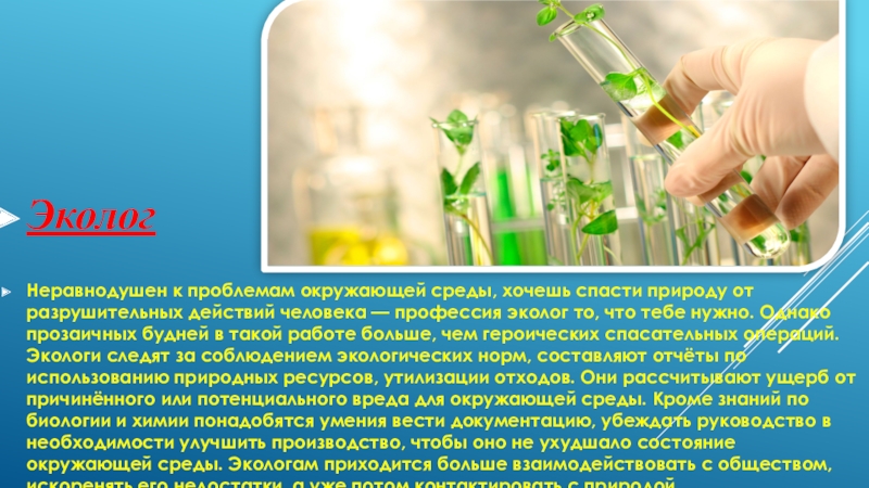 человека — профессия эколог то, что тебе нужно. Однако прозаичных будней в такой работе больше, чем героических спасательных операций. Экологи следят за соблюдением экологических норм, составляют отчёты по использованию природных ресурсов, утилизации отходов. Они рассчитывают ущерб от причинённого или потенциального вреда для окружающей среды. Кроме знаний по биологии и химии понадобятся умения вести документацию, убеждать руководство в необходимости улучшить производство, чтобы оно не ухудшало состояние окружающей среды. Экологам приходится больше взаимодействовать с обществом, искоренять его недостатки, а уже потом контактировать с природой.