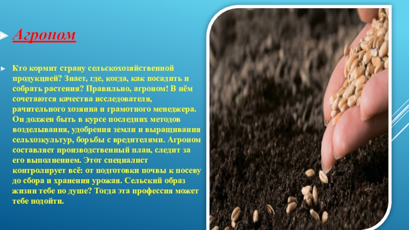 собрать растения? Правильно, агроном! В нём сочетаются качества исследователя, рачительного хозяина и грамотного менеджера. Он должен быть в курсе последних методов возделывания, удобрения земли и выращивания сельхозкультур, борьбы с вредителями. Агроном составляет производственный план, следит за его выполнением. Этот специалист контролирует всё: от подготовки почвы к посеву до сбора и хранения урожая. Сельский образ жизни тебе по душе? Тогда эта профессия может тебе подойти.