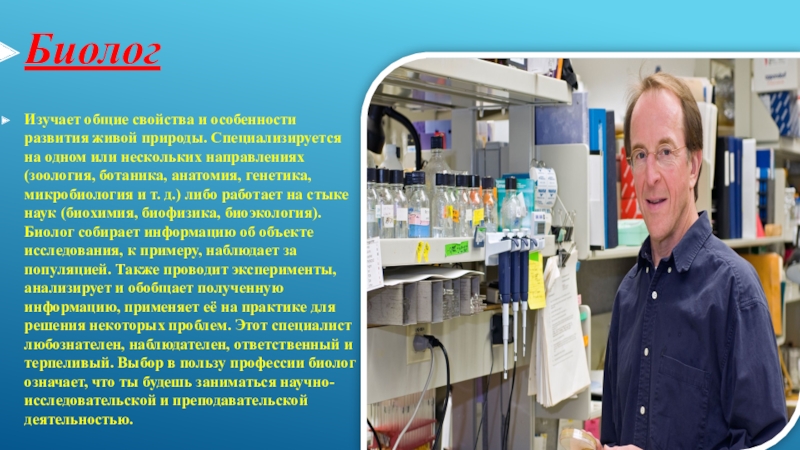 или нескольких направлениях (зоология, ботаника, анатомия, генетика, микробиология и т. д.) либо работает на стыке наук (биохимия, биофизика, биоэкология). Биолог собирает информацию об объекте исследования, к примеру, наблюдает за популяцией. Также проводит эксперименты, анализирует и обобщает полученную информацию, применяет её на практике для решения некоторых проблем. Этот специалист любознателен, наблюдателен, ответственный и терпеливый. Выбор в пользу профессии биолог означает, что ты будешь заниматься научно-исследовательской и преподавательской деятельностью.