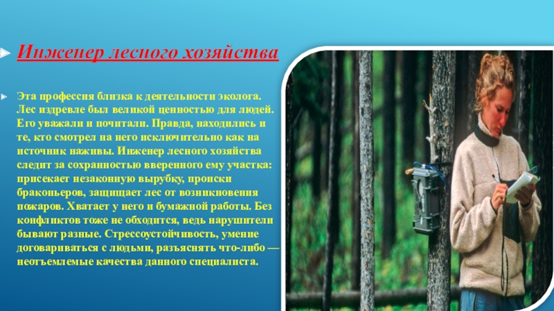 великой ценностью для людей. Его уважали и почитали. Правда, находились и те, кто смотрел на него исключительно как на источник наживы. Инженер лесного хозяйства следит за сохранностью вверенного ему участка: присекает незаконную вырубку, происки браконьеров, защищает лес от возникновения пожаров. Хватает у него и бумажной работы. Без конфликтов тоже не обходится, ведь нарушители бывают разные. Стрессоустойчивость, умение договариваться с людьми, разъяснять что-либо — неотъемлемые качества данного специалиста.
