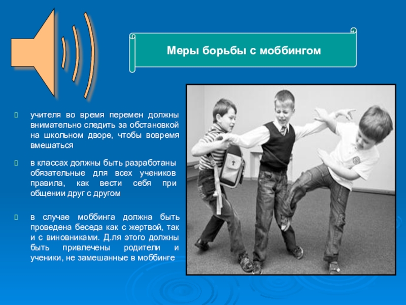 в случае моббинга должна быть проведена беседа как с жертвой, так и с виновниками. Д.ля этого должны быть привлечены родители и ученики, не замешанные в моббинге