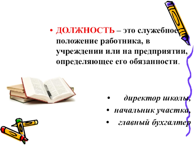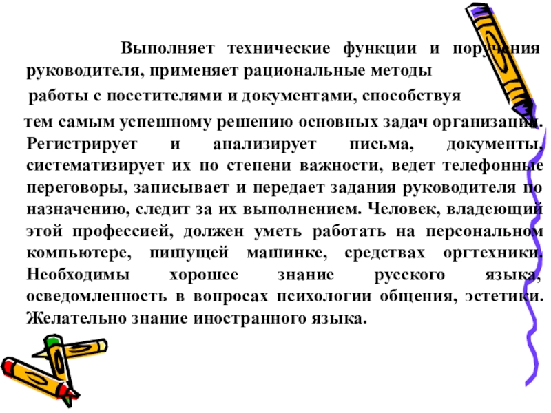 тем самым успешному решению основных задач организации. Регистрирует и анализирует письма, документы, систематизирует их по степени важности, ведет телефонные переговоры, записывает и передает задания руководителя по назначению, следит за их выполнением. Человек, владеющий этой профессией, должен уметь работать на персональном компьютере, пишущей машинке, средствах оргтехники. Необходимы хорошее знание русского языка, осведомленность в вопросах психологии общения, эстетики. Желательно знание иностранного языка.