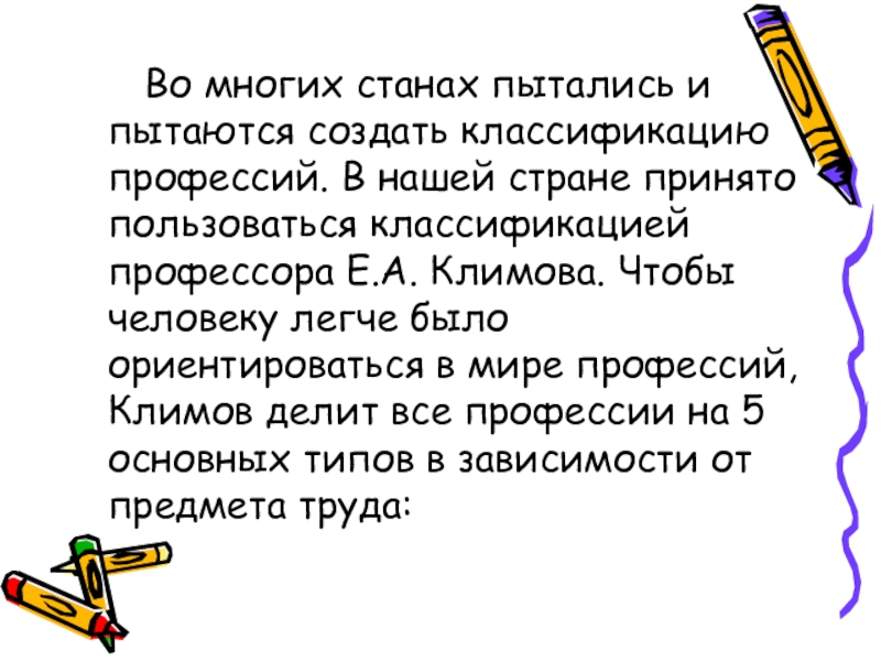профессий. В нашей стране принято пользоваться классификацией профессора Е.А. Климова. Чтобы человеку легче было ориентироваться в мире профессий, Климов делит все профессии на 5 основных типов в зависимости от предмета труда:
