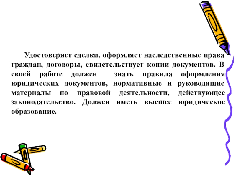 сделки, оформляет наследственные права граждан, договоры, свидетельствует копии документов. В своей работе должен знать правила оформления юридических документов, нормативные и руководящие материалы по правовой деятельности, действующее законодательство. Должен иметь высшее юридическое образование.