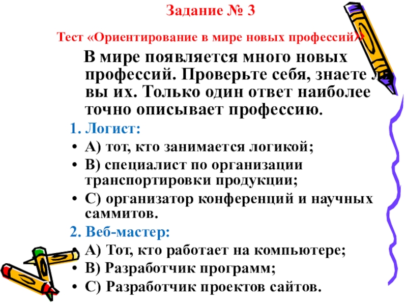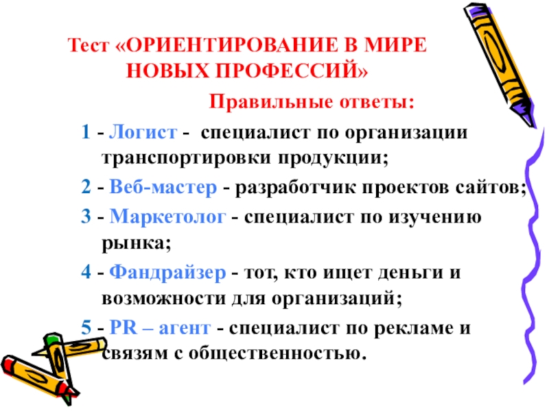 Слайд 33Тест «ОРИЕНТИРОВАНИЕ В МИРЕ НОВЫХ ПРОФЕССИЙ»