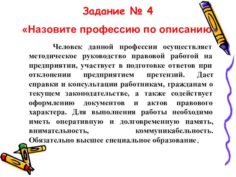 руководство правовой работой на предприятии, участвует в подготовке ответов при отклонении предприятием претензий. Дает справки и консультации работникам, гражданам о текущем законодательстве, а также содействует оформлению документов и актов правового характера. Для выполнения работы необходимо иметь оперативную и долговременную память, внимательность, коммуникабельность. Обязательно высшее специальное образование.