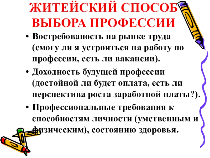 Слайд 29ЖИТЕЙСКИЙ СПОСОБ ВЫБОРА ПРОФЕССИИ