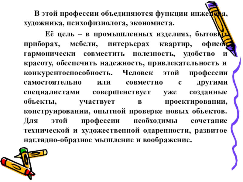 Её цель – в промышленных изделиях, бытовых приборах, мебели, интерьерах квартир, офисов гармонически совместить полезность, удобство и красоту, обеспечить надежность, привлекательность и конкурентоспособность. Человек этой профессии самостоятельно или совместно с другими специалистами совершенствует уже созданные объекты, участвует в проектировании, конструировании, опытной проверке новых объектов. Для этой профессии необходимы сочетание технической и художественной одаренности, развитое наглядно-образное мышление и воображение.