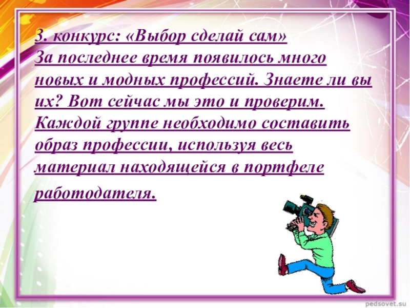 Это сайт презентаций, где можно хранить и обмениваться своими презентациями, докладами, проектами, шаблонами в формате PowerPoint с другими пользователями. Мы помогаем школьникам, студентам, учителям, преподавателям хранить и обмениваться учебными материалами.