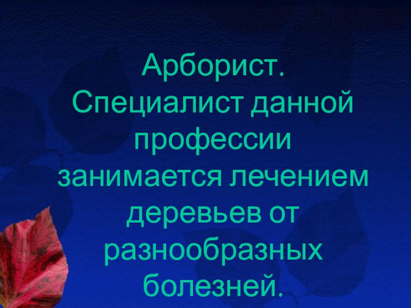 Слайд 8Арборист. Специалист данной профессии занимается лечением деревьев от разнообразных болезней.