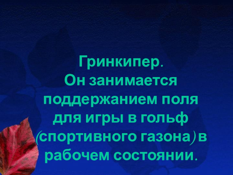 Слайд 10Гринкипер. Он занимается поддержанием поля для игры в гольф (спортивного газона) в