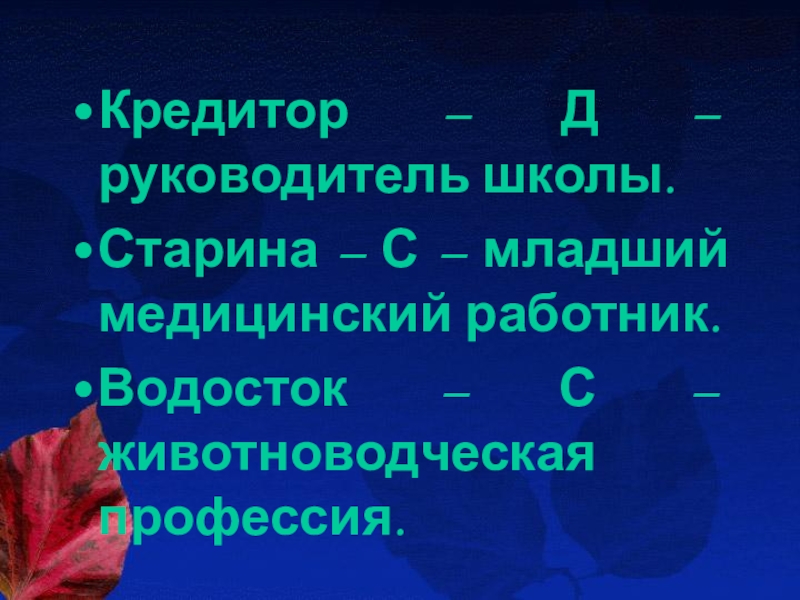 Кредитор – Д – руководитель школы.Старина – С – младший медицинский работник.Водосток – С – животноводческая профессия.
