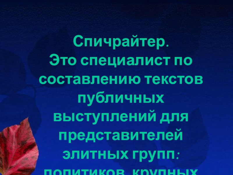 Слайд 11Спичрайтер. Это специалист по составлению текстов публичных выступлений для представителей элитных групп: