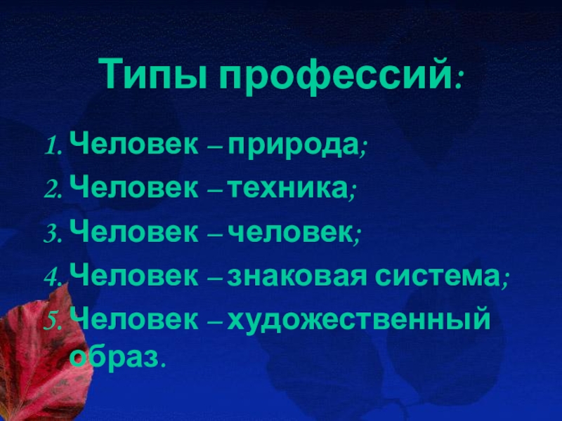 Типы профессий:Человек – природа;Человек – техника;Человек – человек;Человек – знаковая система;Человек – художественный образ.