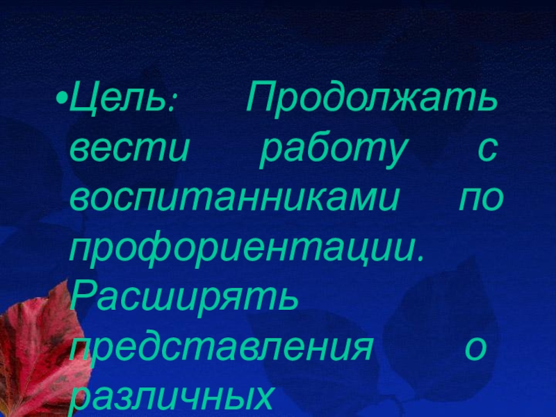 Слайд 2Цель: Продолжать вести работу с воспитанниками по профориентации. Расширять представления о