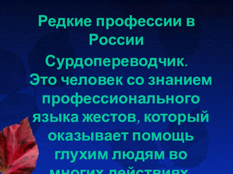 Редкие профессии в РоссииСурдопереводчик.  Это человек со знанием профессионального языка жестов, который оказывает помощь глухим людям