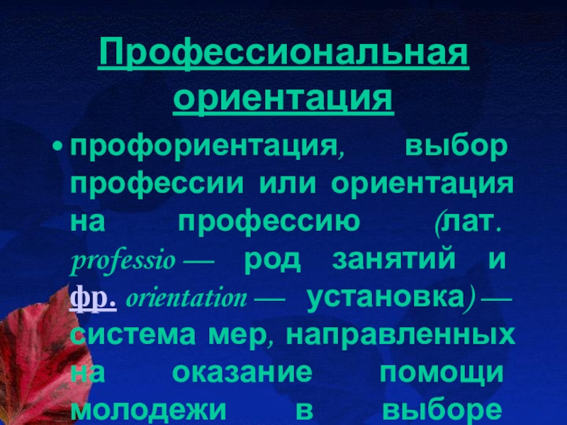 занятий и фр. orientation — установка) — система мер, направленных на оказание помощи молодежи в выборе профессии.