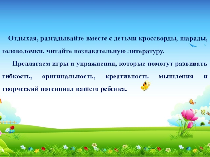 Отдыхая, разгадывайте вместе с детьми кроссворды, шарады, головоломки, читайте познавательную литературу.