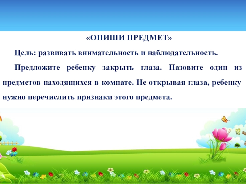 Предложите ребенку закрыть глаза. Назовите один из предметов находящихся в комнате. Не открывая глаза, ребенку нужно перечислить признаки этого предмета.