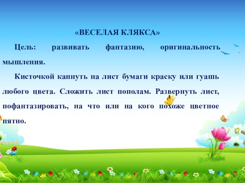Кисточкой капнуть на лист бумаги краску или гуашь любого цвета. Сложить лист пополам. Развернуть лист, пофантазировать, на что или на кого похоже цветное пятно.