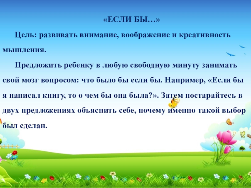 Предложить ребенку в любую свободную минуту занимать свой мозг вопросом: что было бы если бы. Например, «Если бы я написал книгу, то о чем бы она была?». Затем постарайтесь в двух предложениях объяснить себе, почему именно такой выбор был сделан.