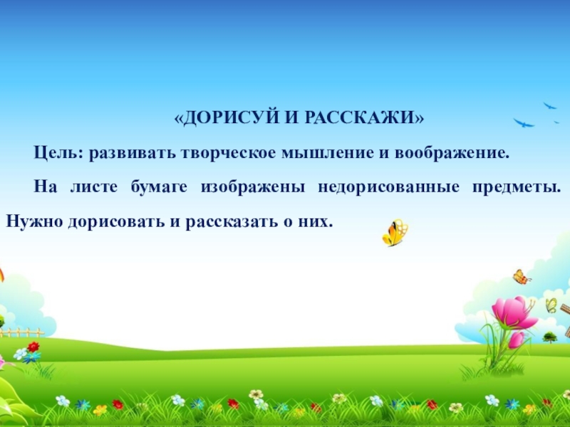 На листе бумаге изображены недорисованные предметы. Нужно дорисовать и рассказать о них.
